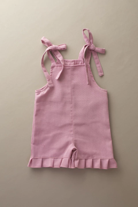 A parte inferior da jardineira é adornada com um lindo babado que adiciona um toque extra de fofura. Possui alças com amarração de laço nos ombros, permitindo um ajuste e um visual adorável. Essas alças com regulagem também permitem que a jardineira se ajuste confortavelmente ao corpo da menina à medida que ela cresce.